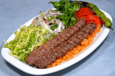 100% كباب لحم طازج محلي، مع سلطة وبيلاو